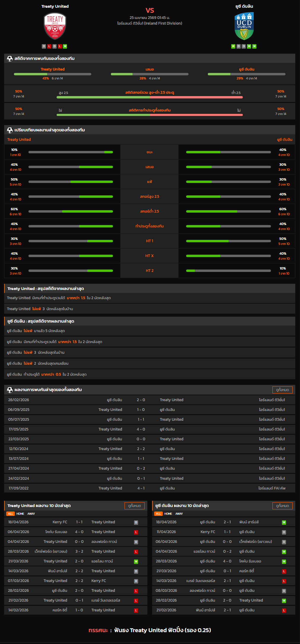 วิเคราะห์บอล ไอร์แลนด์ ดิวิชั่น 1 2025-26 Treaty United VS ยูซี ดับลิน