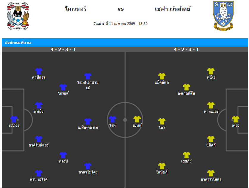 เชฟฯ เว้นส์เดย์ (4-2-3-1) : เซนี่ เดียง - ชอน ฟูซีเร่, เลียม พาลเมอร์, โคล แม็คกี, ทาโย่ อาดาราโมล่า - สวานเต้ อิงเกลส์สัน, เจย์เด้น เฮสกีย์ - ชาร์ลี แม็คนีลล์, จามาล โลว์, โอลาฟ โคบัชกี้ - เจอร์รี่ เยทส์